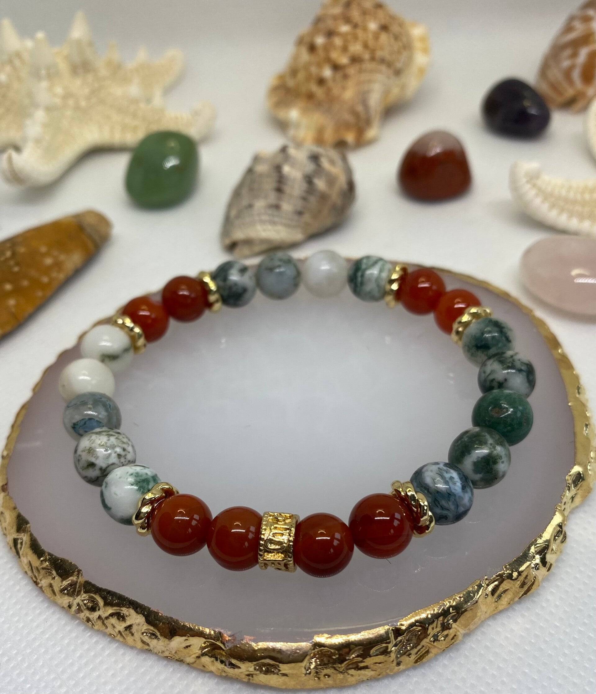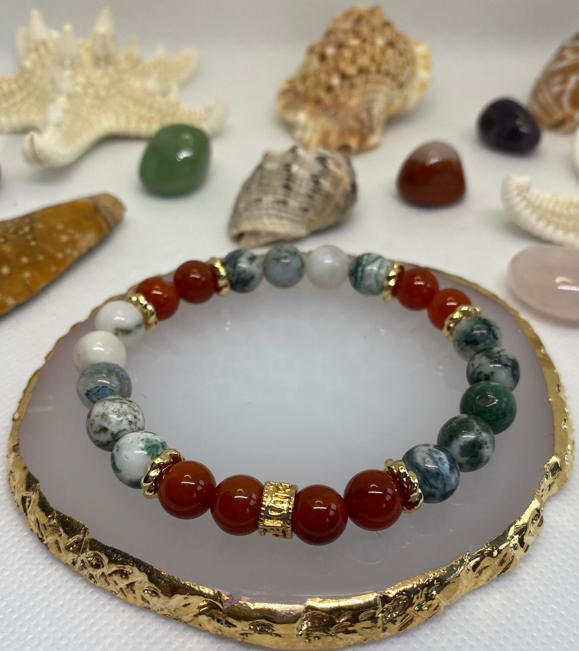 Bracelet élastique agate d'arbre catégorie AB,cornaline rouge origine Brésil catégorie A entretoise acier inoxydable plaqué or , perles de 8 millimètres disponible en plusieurs tailles ou fait sur mesure sur demande