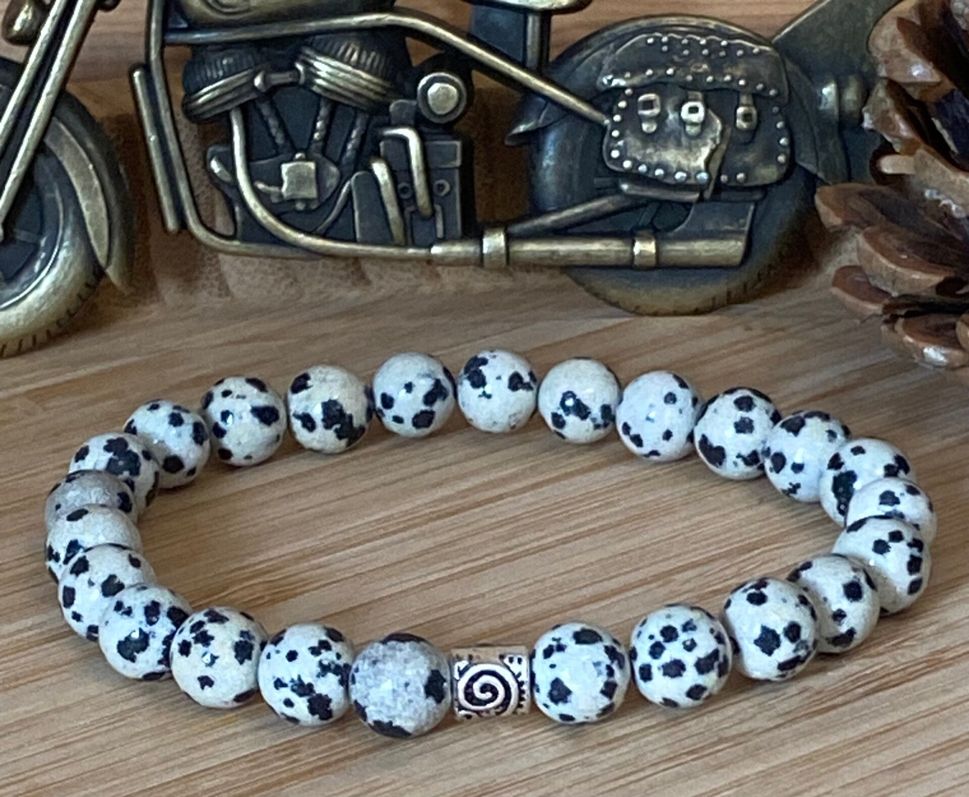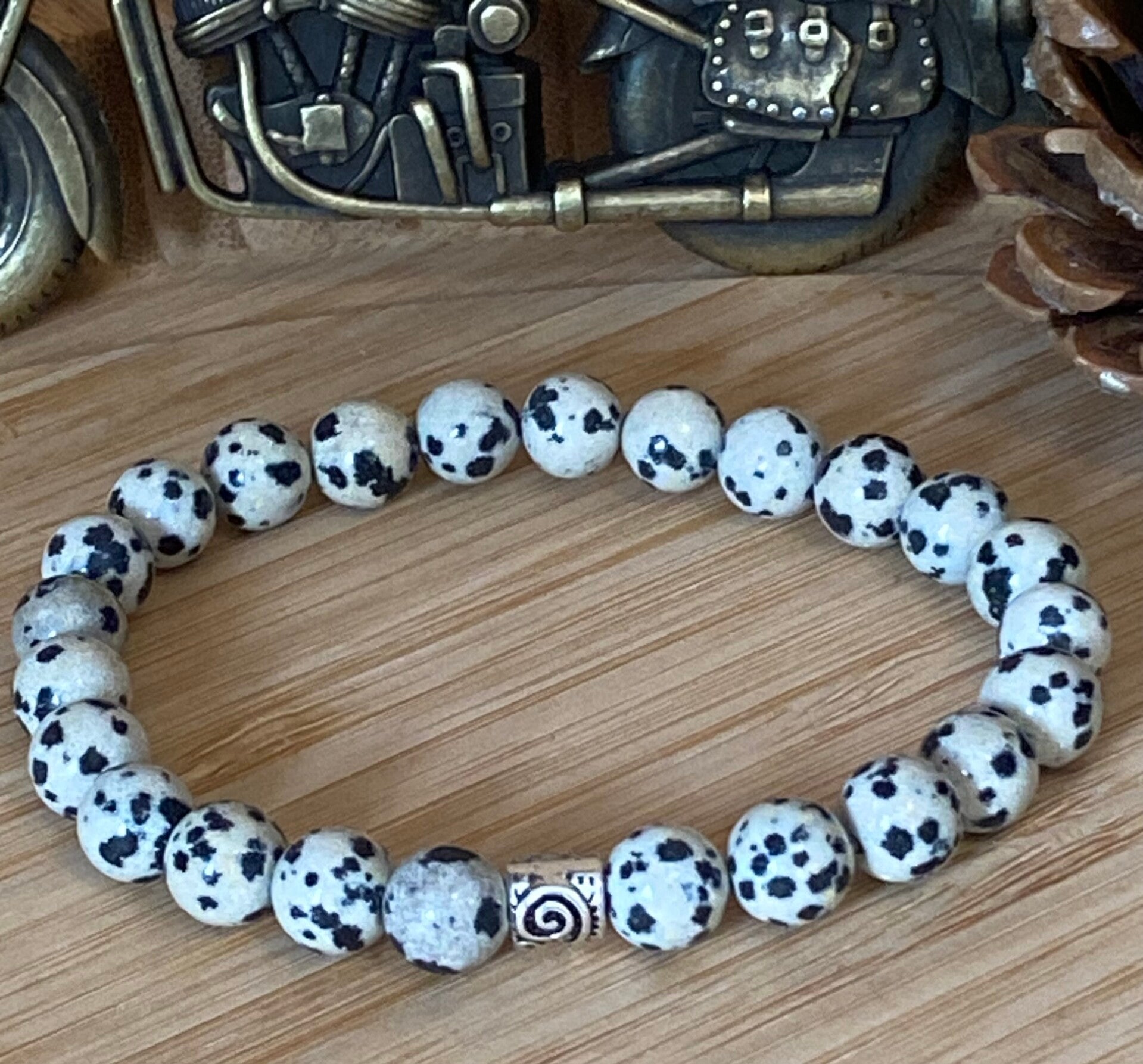 Bracelet élastique fait main perles de diamètre 8 millimètres , avec perles jaspe dalmatien grade 1 A origine chine peut-être fait sur mesure avec la taille du tour de poignet 😊