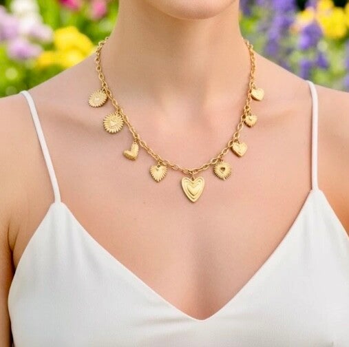 Collier en acier inoxydable maille large de couleur or ornée de breloques