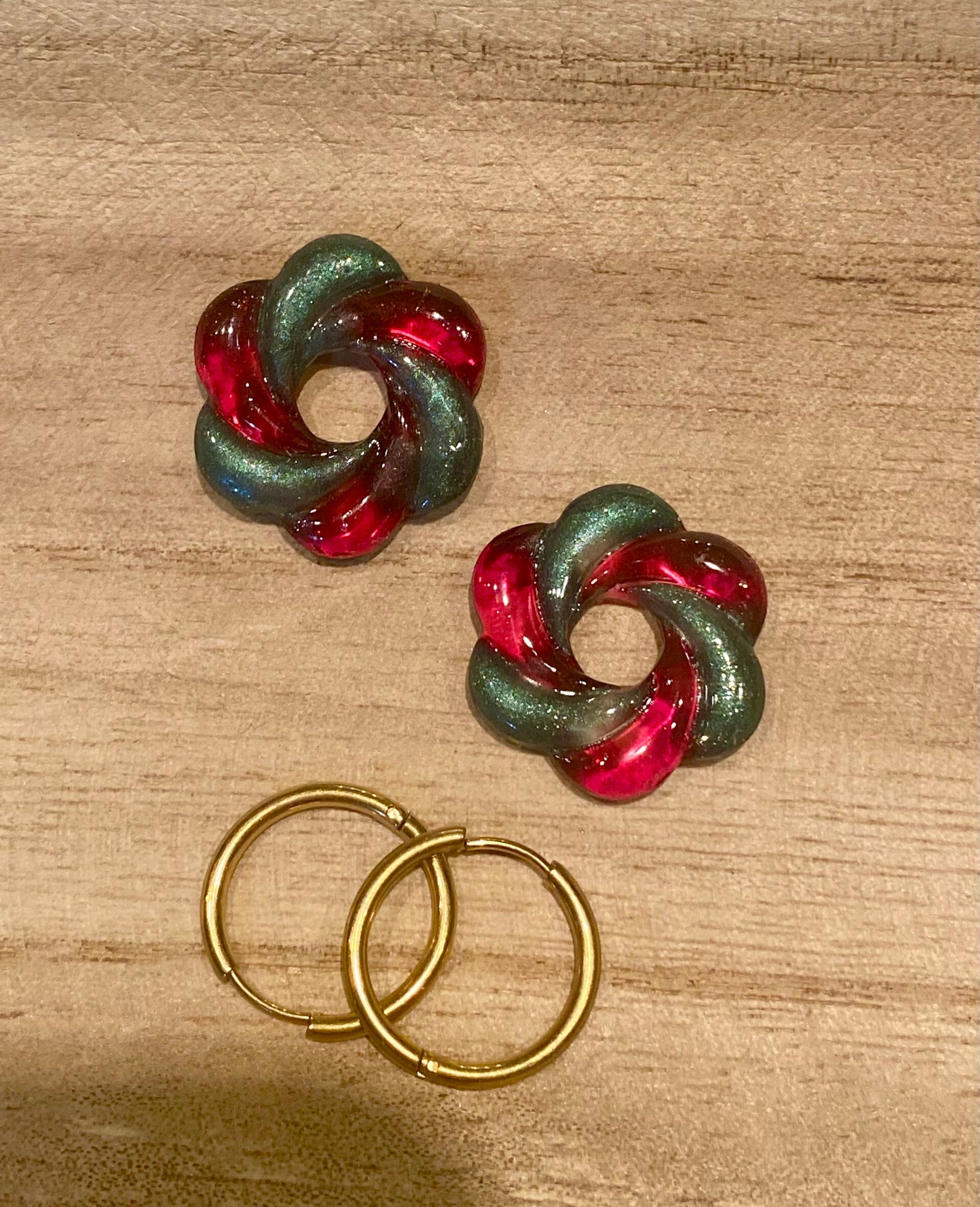 La paire de Pampille sans créoles de forme tourbillon de couleur rouge et verte faite à la main en résine uv de 33 millimètres