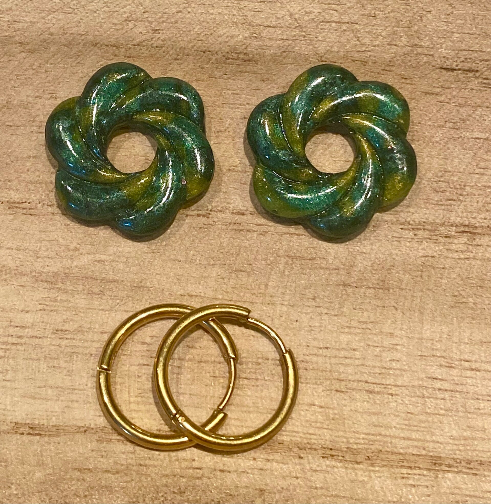 La paire de Pampille de forme tourbillon de couleur verte avec des reflets jaune faite à la main en résine uv de 33 millimètres